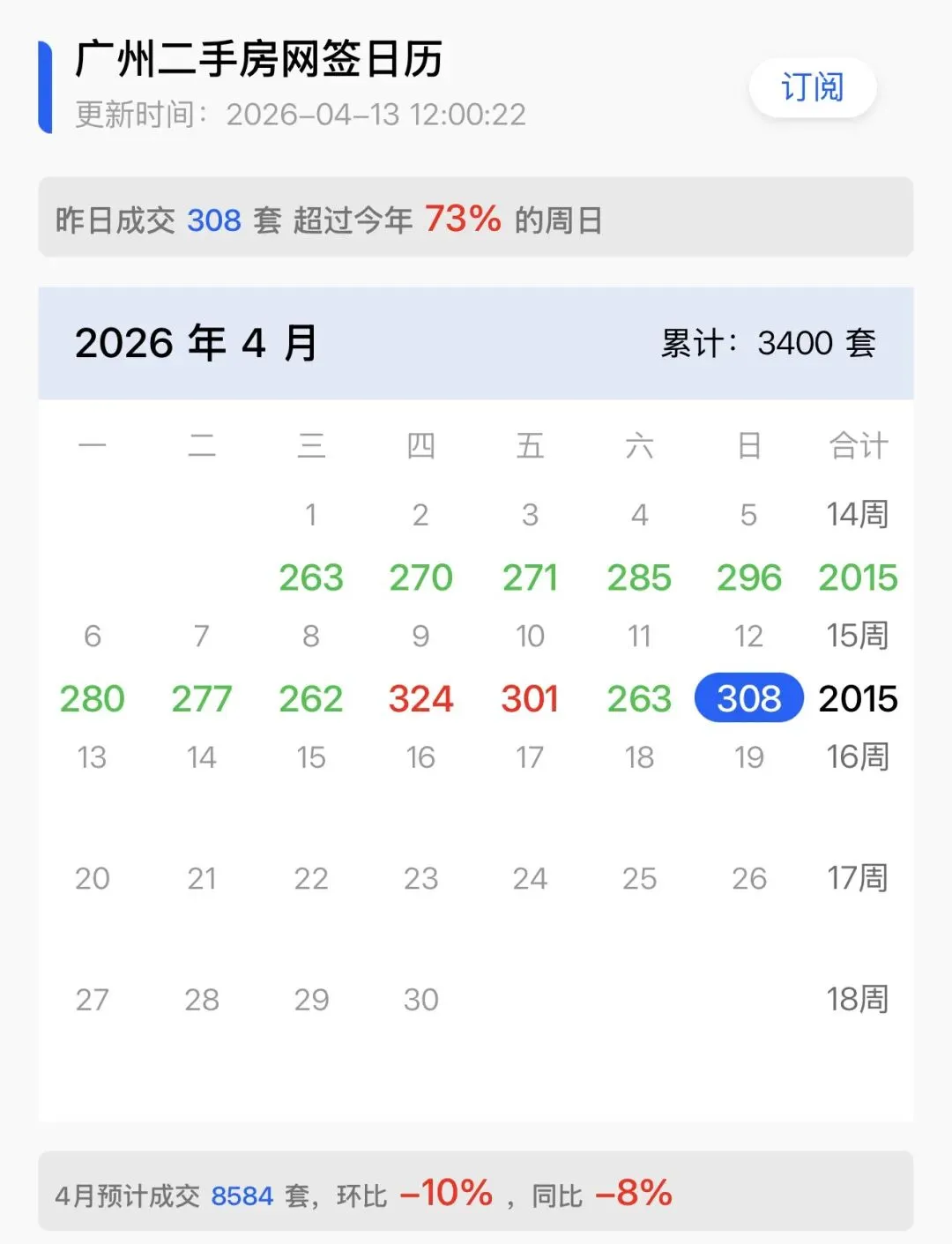 从广州4月1-12日数据来看,广州小阳春基本稳住,并且持续火热中。其中二手房12天成交3400套,预估全月破8000套,本周已连续三日破300套,预估略低于3月9000套,但不排除后续爆发,追平。
