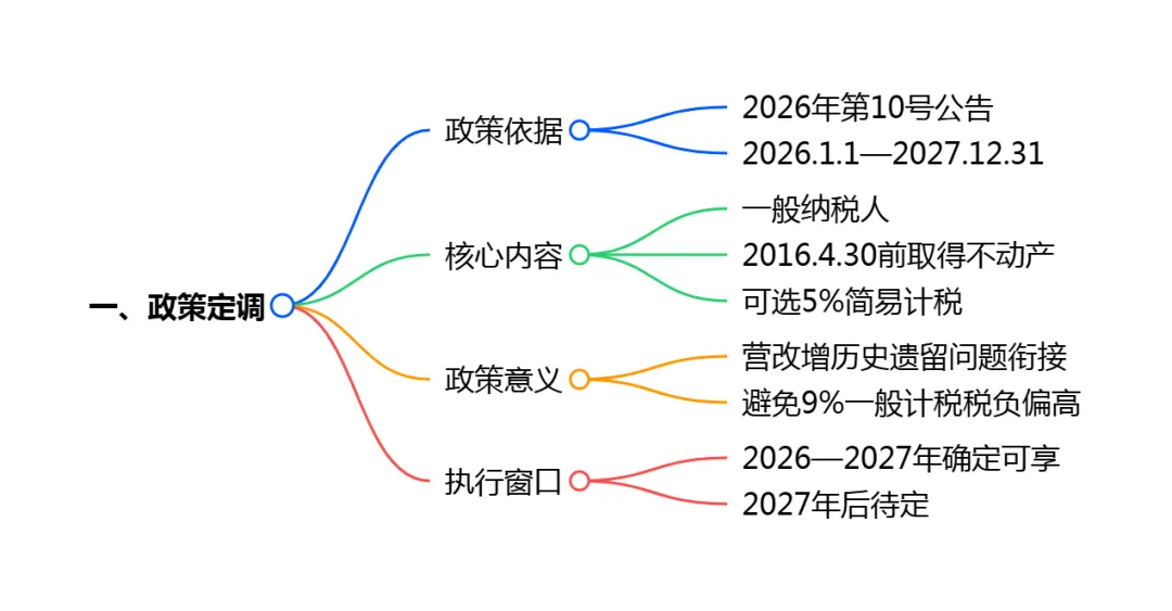 核心结论先行:2026年第10号公告明确,一般纳税人销售2016年4月30日前取得(含自建)的不动产,2026年1月1日至2027年12月31日期间可选择适用简易计税方法,按5%征收率计算缴纳增值税,政策红利再续两年。