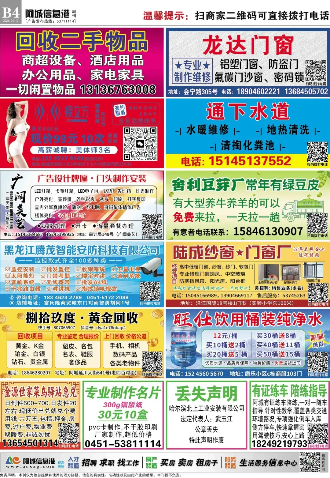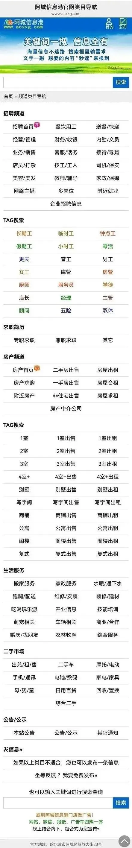 本次分类信息均来自阿城信息港官网,凡“收取服装费、押金、报名费等各种费用”或加qq/微信联系、无需任何条件、工作地点不限的均有欺诈嫌疑,请保持警惕。
