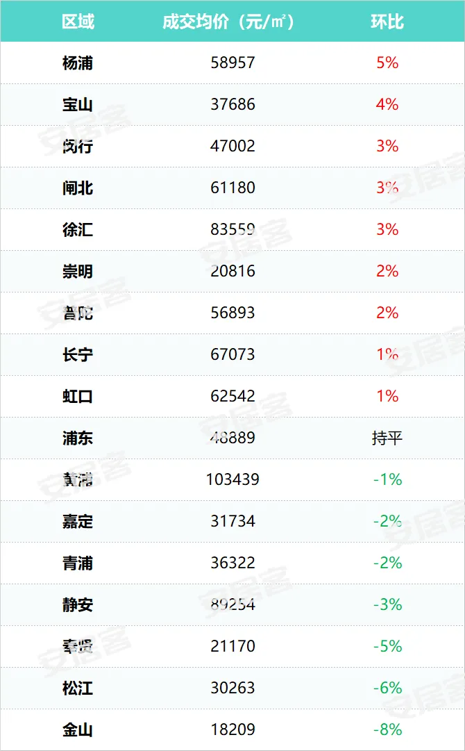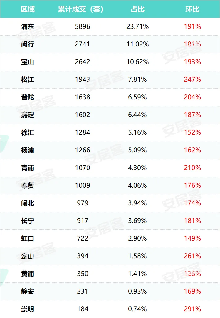 就连远郊崇明,虽然总量仅184套,但环比暴涨291%,成为全市涨幅最高的区域。