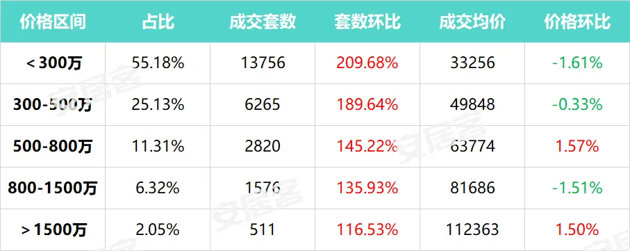 从总价看,300万以下的房源成交占比55.18%,超过一半,套数环比暴增209.68%。也就是说,每2套成交的房子里,就有1套总价不到300万。