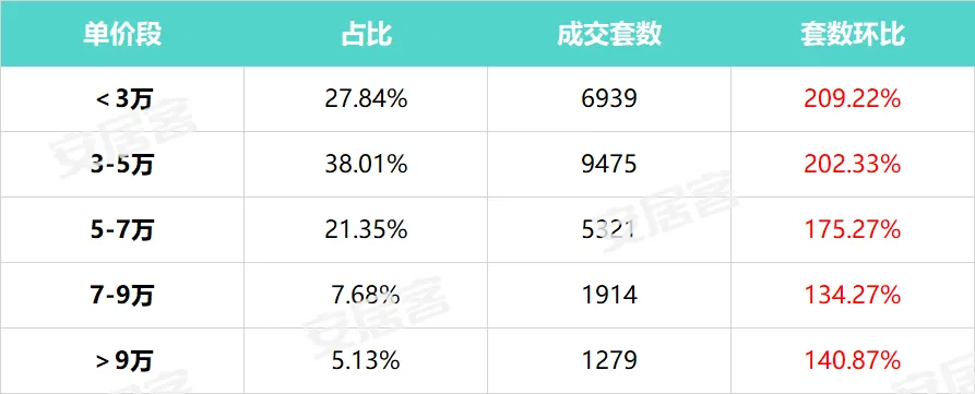 从单价看,3-5万/㎡的单价段最受欢迎,成交占比38.01%,套数环比也大涨202.33%。