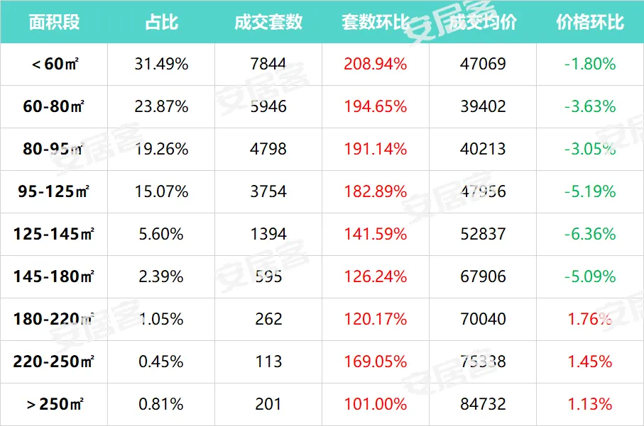 从面积看,60㎡以下的小户型成交占比31.49%,环比增幅同样高达208.94%。