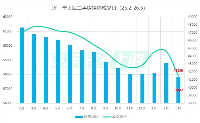 再看全市均价走势:3月成交均价约41506元/㎡,相比2月的44594元/㎡,反而有所回落,下跌近7%,近13个月跌幅最大。而挂牌均价也从2月的58790元/㎡降至57842元/㎡。