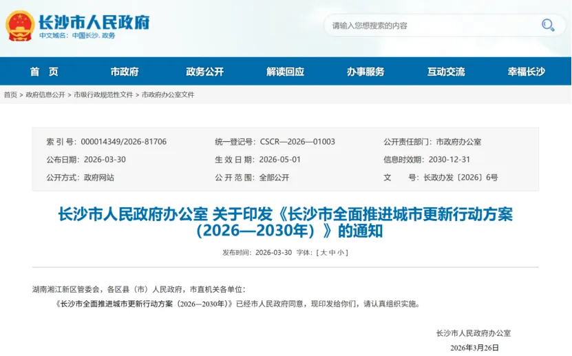 3月30日,长沙正式印发《全面推进城市更新行动方案(2026—2030年)》,这是未来5年楼市、板块、房价比较硬核的政策依据,我会客观、专业把文件讲透,并直接给出2026—2027年板块走势与购房参考。