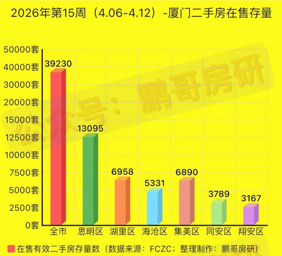 厦门目前全市在售有效二手房存量总数39230套,环比上周减少103套!